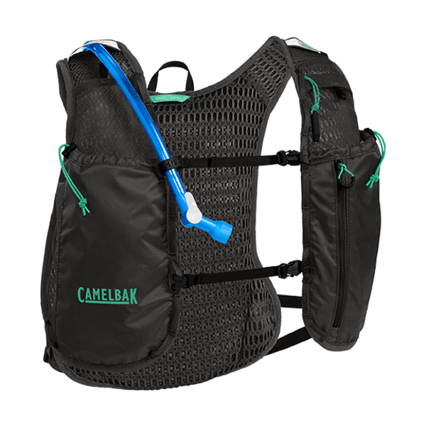Circuit Vesten leveres med en 1,5L/50oz CRUX™-beholder, der leverer 20% mere vand pr. slurk, og den er let nok til at kunne klare dig mange kilometer. Frontpanelerne har fire forskellige bløde flaskelommer, så du kan tilpasse, hvor du opbevarer ekstra væsker eller udstyr.